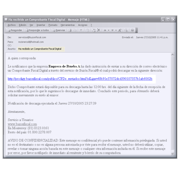 El mensaje de correo electrónico que recibe su cliente o socio de negocios llevará el título: "Ha recibido un Comprobante Fiscal Digital", y el cuerpo contiene su nombre como emisor del CFD así como la liga de descarga del mismo.