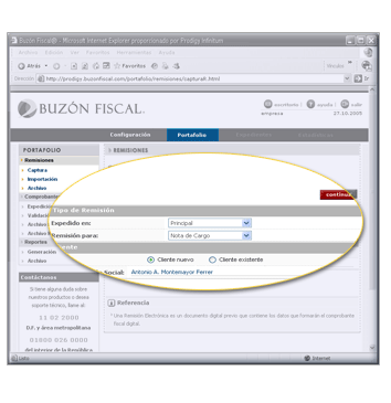 Deberá elegir la opción "Cliente Nuevo" si es la primera vez que genera una remisión electrónica y capturar el nombre o razón social del receptor del comprobante fiscal digital, luego presione el botón "Continuar".